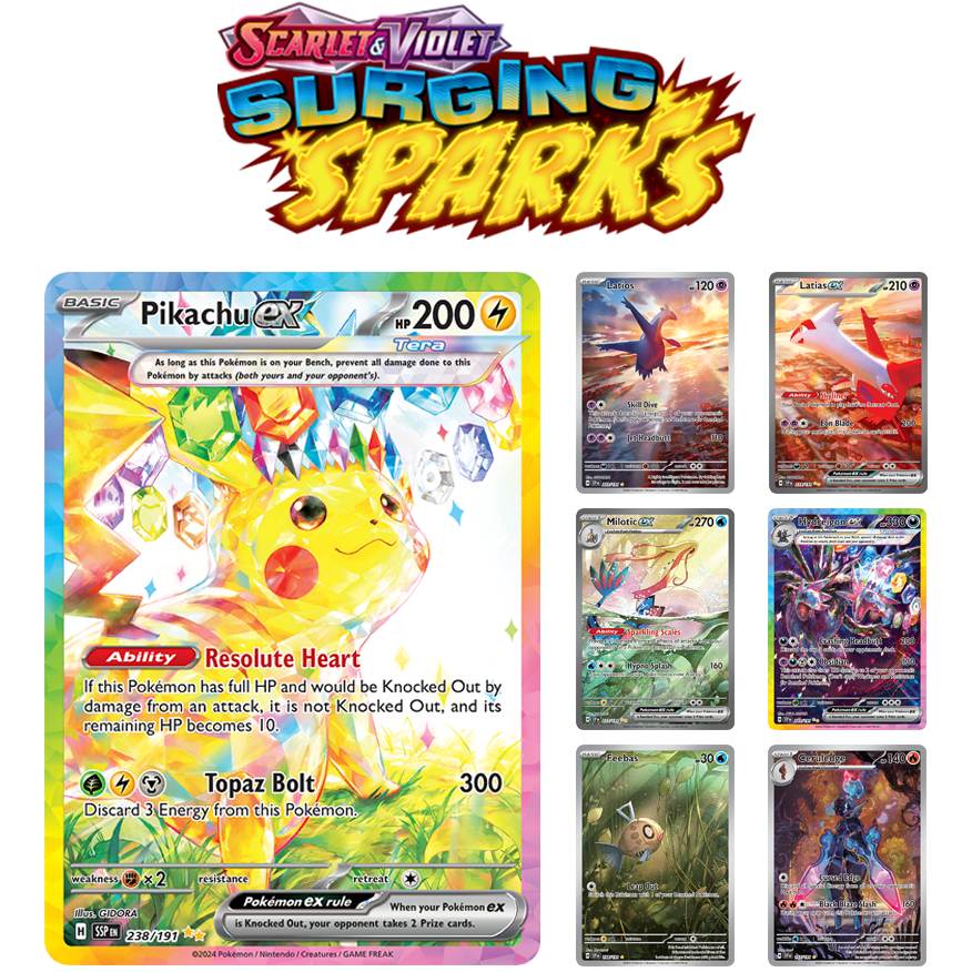 Terawatts of electricity crash down from the sky in a tropical paradise, setting the stage for the supercharged Pikachu ex! With the power of a Stellar Tera Pokémon ex, it lights up the shoreline, revealing a parade of dragon Pokémon led by the towering Alolan Exeggutor ex! Archaludon ex and Latias ex round out the horde, while new ACE SPEC cards and more new Pokémon ex bring surprises of their own. Currents crackle and Dragon types roar in the Pokémon TCG: Scarlet & Violet—Surging Sparks expansion!